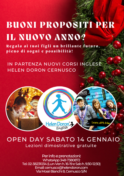 SABATO 14 GENNAIO, nel pomeriggio, vi aspettiamo al nostro OPEN DAY HELEN DORON CERNUSCO, per lezioni dimostrative gratuite (su prenotazione), presso il nostro Learning Centre, in Via Mosé Bianchi 8 a Cernusco s/N!