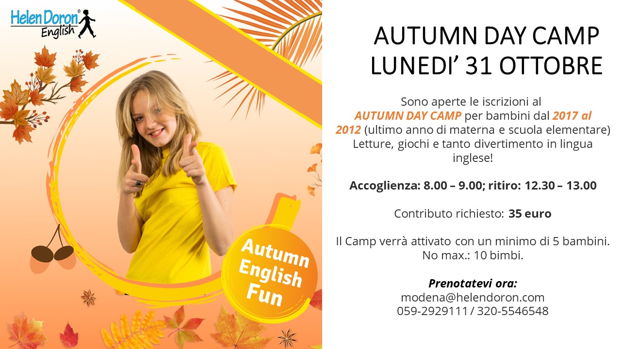 Sono aperte le iscrizioni al AUTUMN DAY CAMP per bambini dal 2017 al 2012 (ultimo anno di materna e scuola elementare) Letture, giochi e tanto divertimento in lingua inglese!
