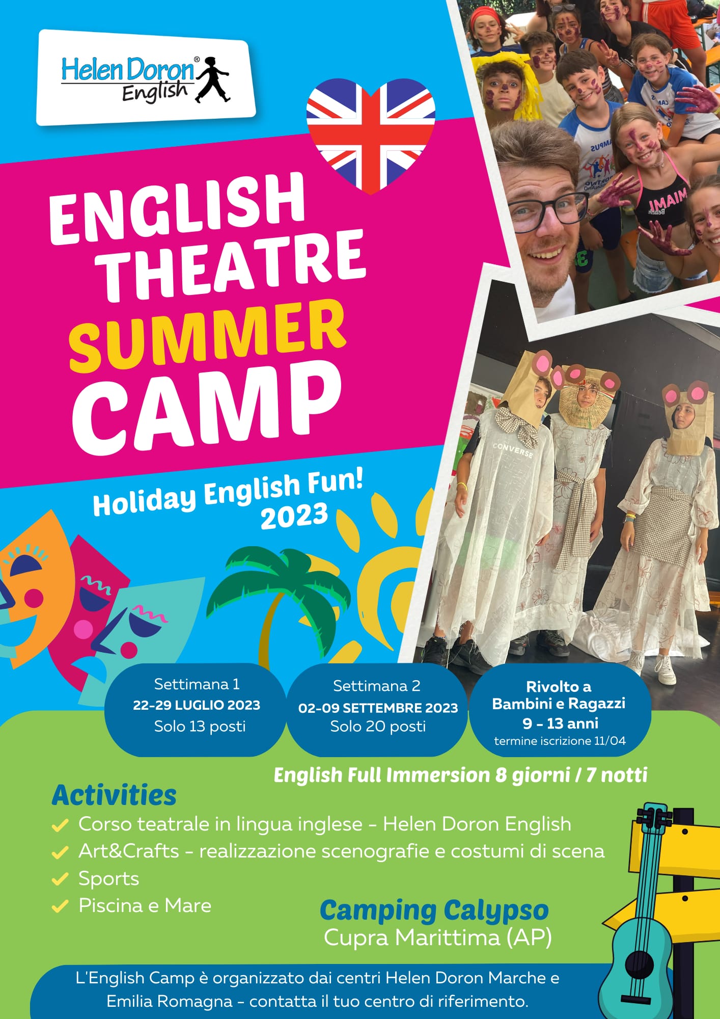 Come lo scorso anno si terrà a Cupra Marittima (AP) presso il Camping Villaggio Calypso: 8 giorni e 7 notti tutti in inglese in cui si faranno tante attività incentrate sul teatro e sullo sport, senza però tralasciare mare, piscina e divertimento.